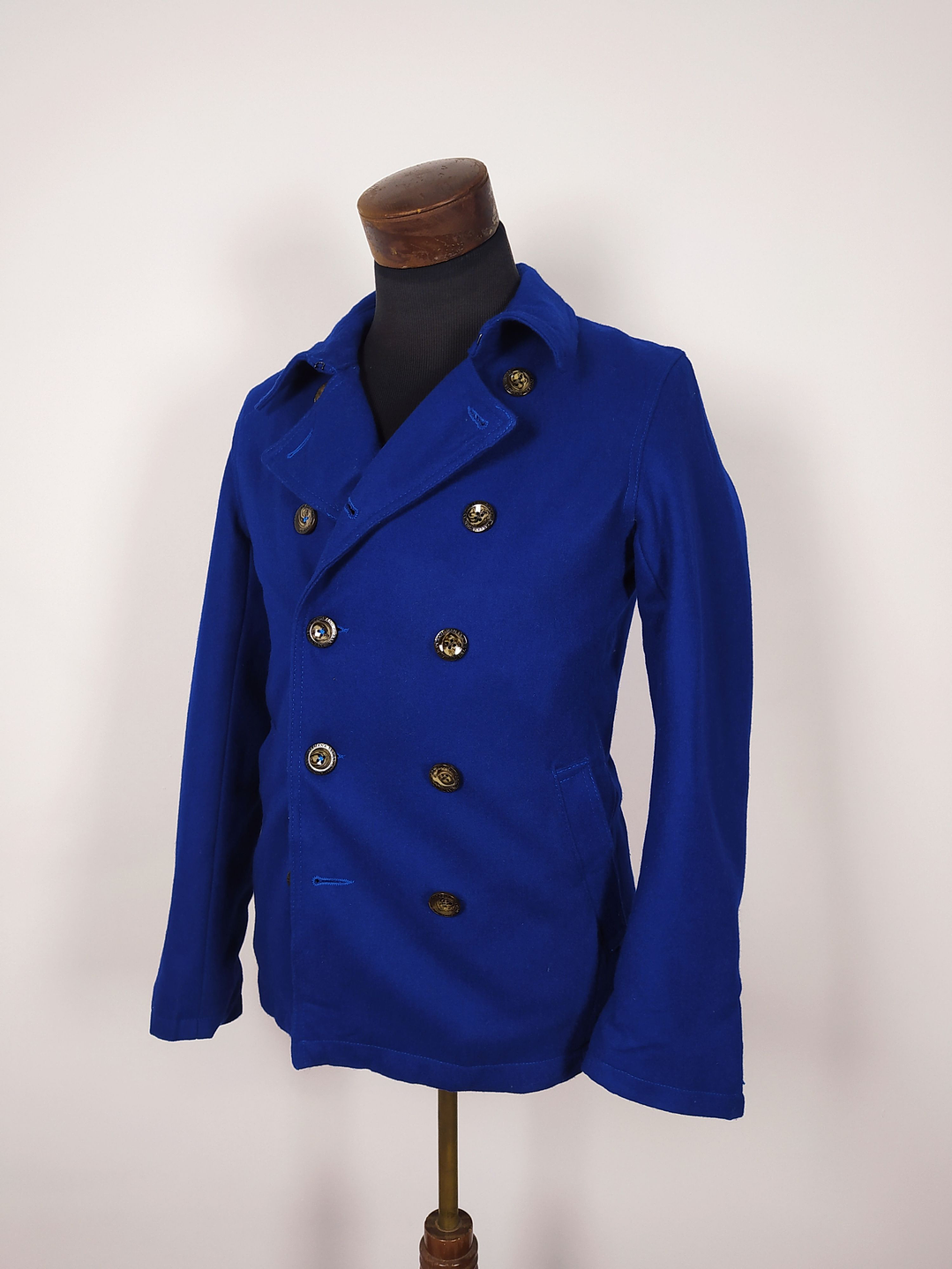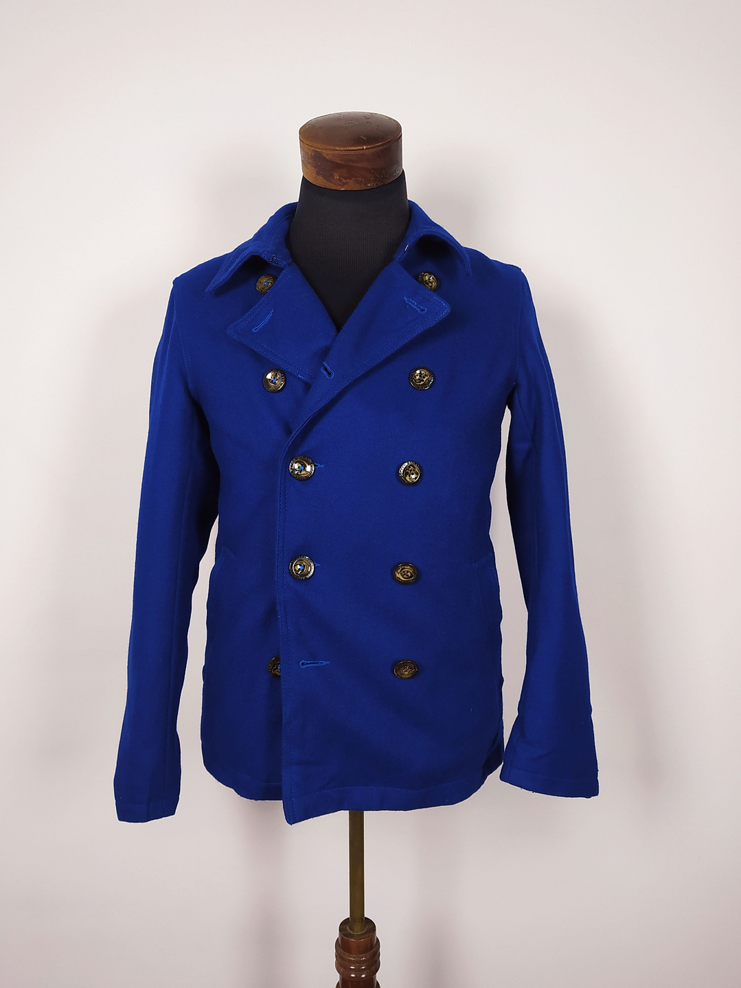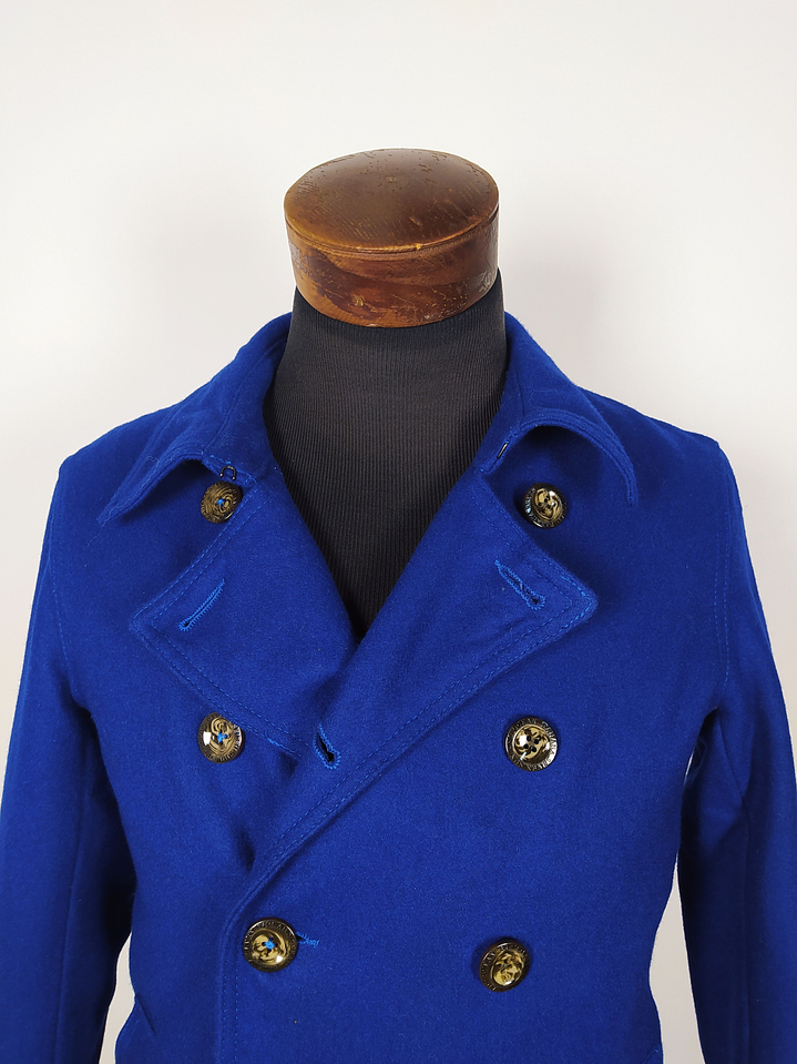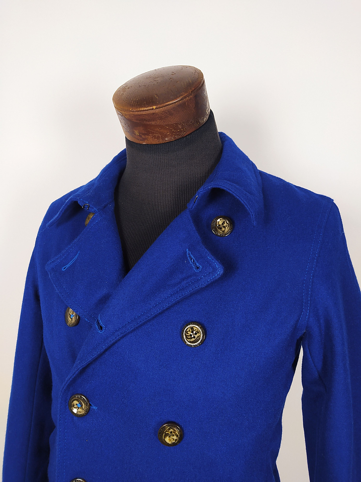 Pieza llamativa y juvenil, este abrigo tipo marinero en color azul rey es una alternativa vibrante al clásico peacoat. Confeccionado en una mezcla suave de 60% lana y seda artificial, entrega abrigo sin perder ligereza ni comodidad. Su diseño cruzado de doble botonadura y botones dorados con escudo le aportan un aire elegante y moderno.