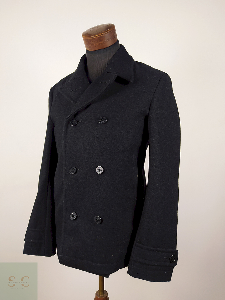 Este abrigo estilo pea coat clásico tiene corte recto, botonadura doble al frente, cuello ancho y solapas marcadas. Las mangas llevan detalle de presilla con botón en los puños, lo que le da un acabado refinado. Al estar confeccionado en un 90% de lana, ofrece excelente abrigo con una textura densa, ideal para días fríos. El color negro intenso lo hace versátil y fácil de combinar con cualquier look formal o casual.