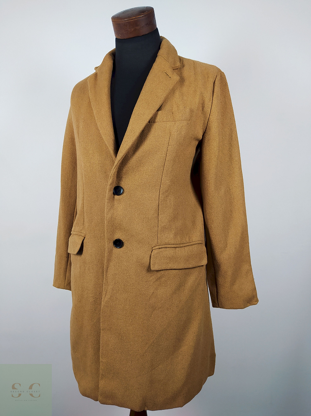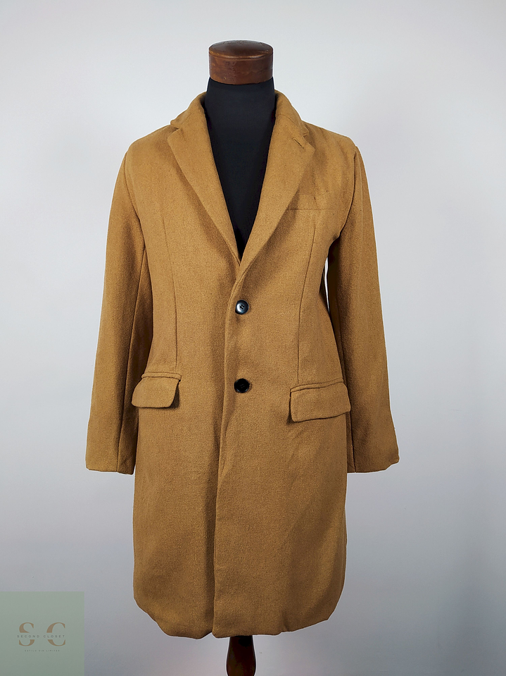 Abrigo largo color camel con solapa clásica y estructura semi entallada que estiliza la figura. Tiene bolsillos con tapa, bolsillo superior tipo ojal y cierre frontal de dos botones. Su diseño minimalista y moderno transmite sobriedad y sofisticación.