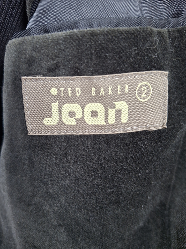 Etiqueta bordada “Ted Baker” en bajo bolsillo, detalle distintivo de la marca.