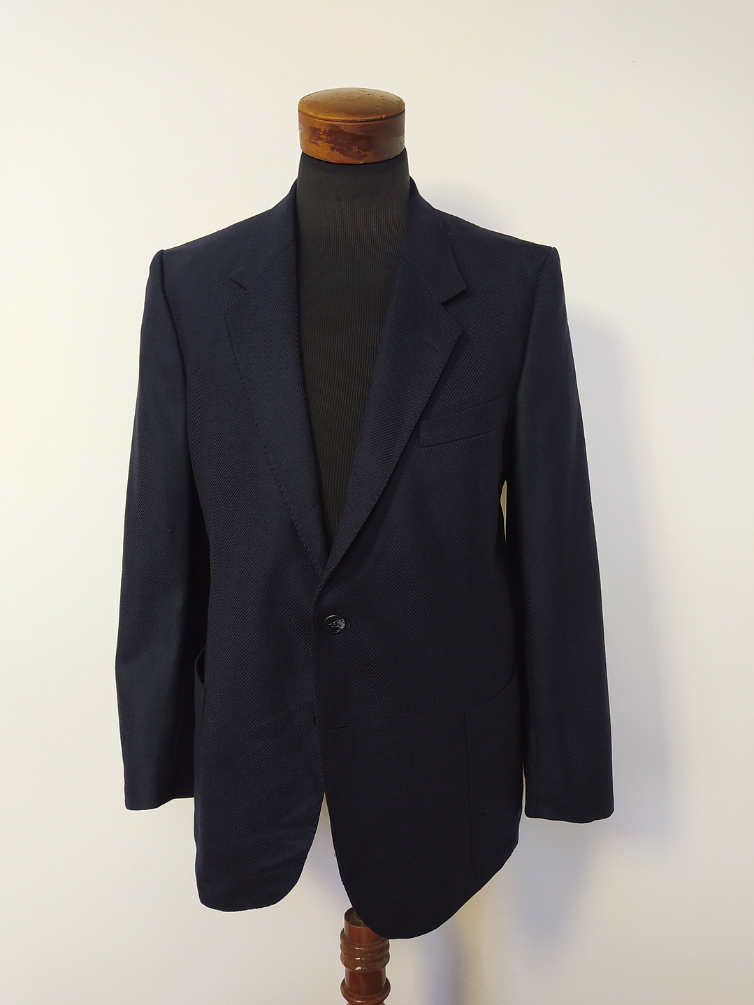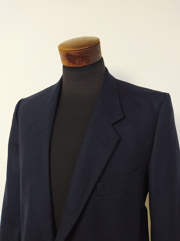 El tejido presenta un patrón sutil en espiga diagonal, que se distingue bajo la luz y añade textura refinada al azul marino.