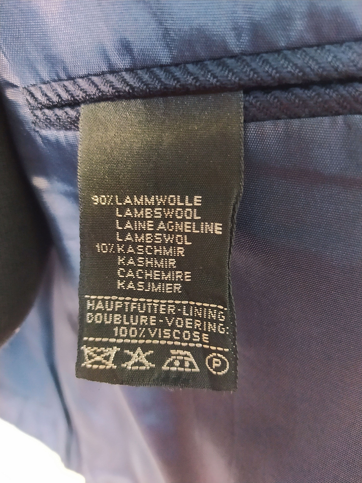 - Etiqueta interior: 90% lambswool (lana de cordero) + 10% cashmere, con forro en 100% viscosa.