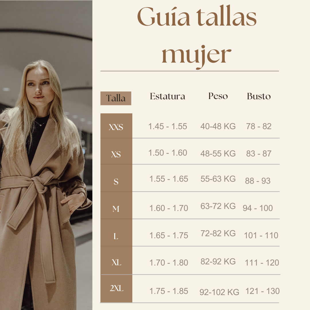 Todas las medidas se toman sobre la prenda, no sobre el cuerpo. Compara estas medidas con un blazer tuyo que ya te quede bien para elegir la talla con mayor precisión.