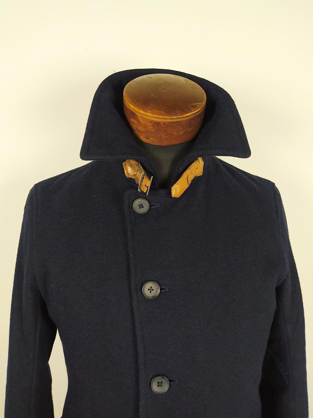 Abrigo de corte moderno y estilizado en tono azul marino profundo, de la marca Tkmixpice, ideal para quienes buscan un diseño elegante y ceñido, perfecto para contexturas delgadas. Este modelo destaca por su cuello alto con detalle interior en eco cuero camel, que aporta un toque original y sofisticado.