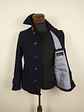 Presenta cierre frontal con cinco botones, bolsillos laterales con tapa, y detalles decorativos en los puños. Su silueta entallada y el largo medio lo hacen ideal para looks urbanos, combinando bien con jeans o pantalón formal.